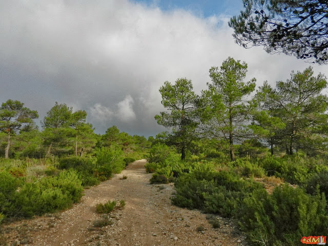 En lugar de seguir por la trillada pista preferimos tomar otra menos pisada que nos dirigiría hacia el cortafuegos que marchaba paralelo. Cuidado porque hay un punto en que hay un grupo de colmenas y el camino pasa justo al lado. Nosotros pasamos despacito y sin hacer ruido y no se alteraron. También se puede ir por la pista superior.